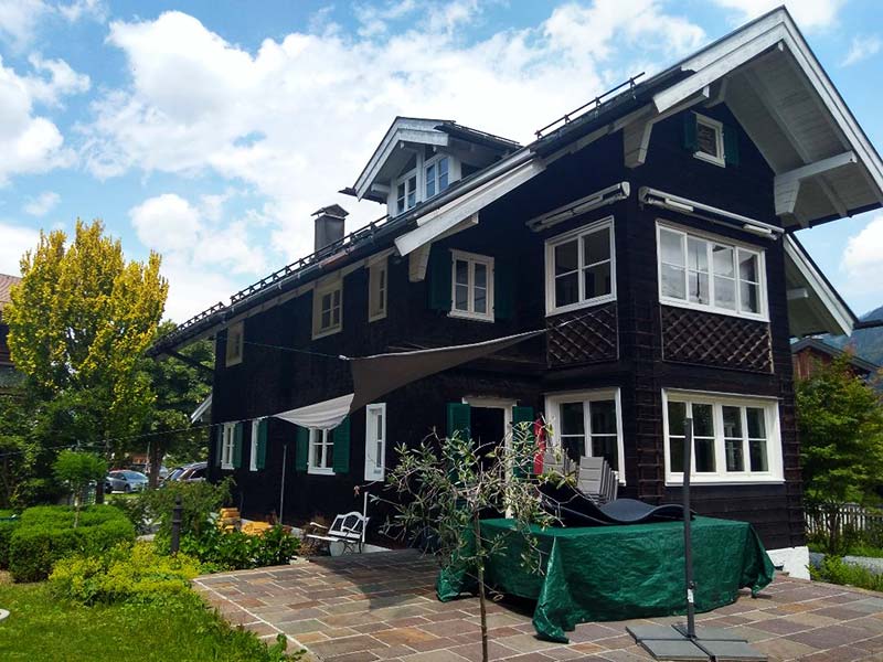 Unser Original Oberstdorfer Holzhaus ist ausgestattet mit wertvollen Intarsien-Holzböden aus Teak und Birke, edlen schwarz-weißen Fliesen, einen Kachelofen, eine große Sonnenterrasse im sonnigen Garten. Doppelgarage, weitere Stellplätze.